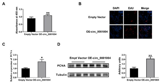 Our previous study showed that miR-709 suppressed the viability of GH3 cells [12]. Thus, we performed CCK8 and EdU assays to determine the effect of rno_circ_0001004 on GH3 cell proliferation. Intriguingly, circ_0001004 significantly promoted GH3 cell proliferation (Figure 4A,B). Moreover, PCNA, the key marker of cell proliferation, was markedly up-regulated both in mRNA and protein levels (Figure 4C,D).