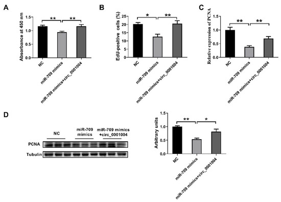Effects of rno_circ_0001004 in reversing the inhibition of cell proliferation by miR-709. (A) The GH3 proliferation was evaluated with CCK-8 kits. (B) EdU-positive cells. (C) PCNA mRNA expression quantified by qRT-PCR. (D) Western blot assay for PCNA protein expression. (* p < 0.05; ** p < 0.01).