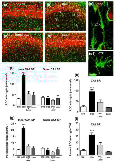 We carried out the quantitative analysis of rod microglia in control, OGD, OGD+Laser and Laser-treated slices, considering only microglia cells longer than 40 µm. As shown (Figure 1f,i), it is possible to appreciate that the density of rod microglia is increased in the inner layer of CA1 SP in OGD-treated slices (+355% vs. controls, *** p < 0.001 vs. all other groups, Figure 1f) and in SR (+290% vs. controls, **p < 0.01 vs. all other groups, Figure 1g), while no changes were observed in the outer layer of CA1 SP. In addition, rod microglia, expressed as percent of total microglia, increased significantly in the inner layer of CA1 SP (+370% vs. controls, *** p < 0.001 vs. all other groups, Figure 1h) and in SR (+240% vs. controls, *** p < 0.001 vs. all other groups Figure 1i), but not in the outer layer of CA1 SP. Although NIR-Laser application to control slices had no effect per se, it completely blocked the appearance of rod microglia in the inner SP and SR of OGD-treated slices (Figure 1f–i).