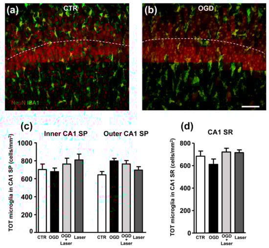 We verified whether an OGD insult might modify the density of microglia in CA1 SP or SR. As apparent in the quantitative analysis of total microglia in the inner and outer SP layers and in the SR of control, OGD, OGD+Laser and Laser-treated slices, we demonstrated that there were no significant differences of microglia density in any of these groups (Figure 2). These data demonstrated that the increase in rod microglia in the outer layer of SP was due to morphological modifications of existing cells and not to increase in the microglia cell number (Figure 2c,d), thus confirming previous findings that showed that rod microglia originate by morphofunctional modifications from resident CNS microglia.