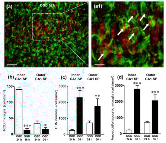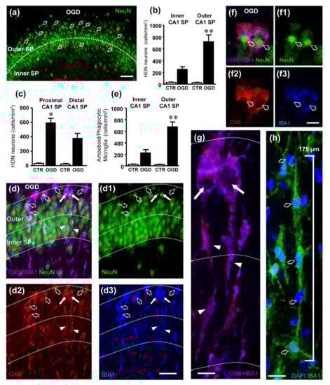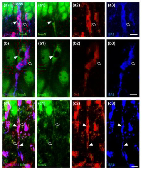 Furthermore, some neurons in CA1 SP showed signs of karyorrhexis, as demonstrated by the lack of nuclear staining (LDN neurons, Figure 4a,a1,b,b1, arrowheads). LDN neurons were too sparse throughout the CA1 SP even after OGD to allow quantitation, and no spatial organization within CA1 SP was apparent. Nevertheless, triple immunostaining with NeuN (green), OX6 (red), and IBA1 (blue) demonstrated that many LDN neurons were phagocytosed by activated rod microglia (Figure 4a,b, open arrows) that enveloped the LDN neuronal cell body.