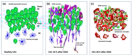 Schematic representation of the healthy CA1 hippocampus (a) and the morphofunctional modifications of microglia and neurons at 24 (b) and 36 h (c) after the OGD. Resting microglia (blue), activated rod microglia (pink-purple), amoeboid/phagocytic microglia (red). A train of rod microglia is shown (b).