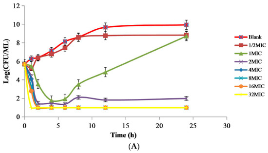 The in vitro and ex vivo killing curves of APR in broth and in ileum fluid were drawn by monitoring the CFU changes during the incubation of Salmonella 10# under a series concentration of APR (1/2 to 32 MIC) for a continuous time period (0, 1, 2, 4, 6, 8, 12 and 24 h) [28].