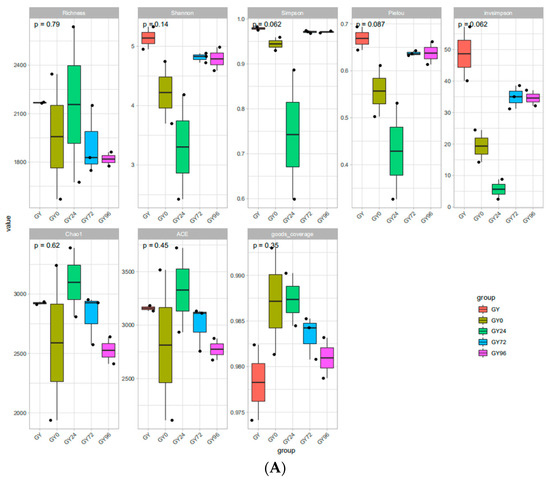 Alpha and beta diversity parameters presented in the five groups. (A) Alpha diversity parameters of richness, Shannon, Simpson, pielou, invsimpson, Chao1, ACE and good coverage; (B) Beta parameters of UPGMA, NMDS, ANOSIM and PCoA.