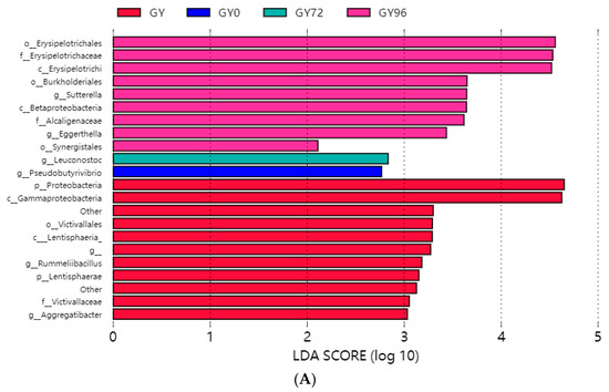 Linear Discriminant Analysis Effect Size (LEfSe) analysis was used to identify biomarkers of ileum microbiota of different stages of clinical trial piglets (Figure 7). The differentially abundant phyla detected showed that the Proteobacteria and Lentisphaerae phylum was predominant in the healthy group, while the most abundant genus in the infection group was Pseudobutyrivibrio. It was found that the Leuconostoc was a predominant genus in the cure group, whereas the Eggerthella, Leuconostoc and Sutterella were found to be a dominant genus in withdraw period (Figure 7A). There was an overrepresentation of Proteobacteria and Lentisphaerae, and underrepresentation of other phyla (Figure 7B).