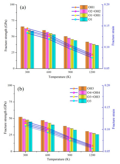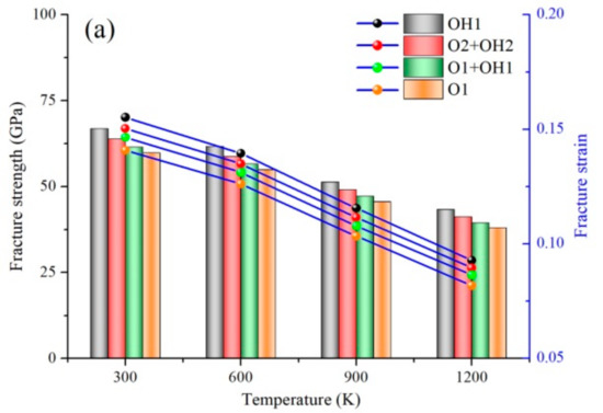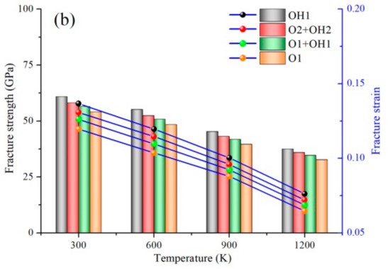 Under the complex high-temperature environment, the mechanical behaviors of h-BN matrix ceramic, such as strength and constitutive relation, are quite different from those in the normal temperature environment, and show obvious temperature dependence. The h-BN matrix ceramic used as external protection or structure undergoes complex thermal and mechanical coupling. Therefore, temperature dependence of interfacial bonding, mechanical properties, and configuration transition in Gr/h-BN containing grain boundaries and functional groups were investigated. The eight types of FGo density, including R = 15% epoxy (O1), R = 15% hydroxyl (OH1), R = 10% epoxy + R = 5% hydroxyl (O1 + OH1), R = 5% epoxy + R = 10% hydroxyl (O2 + OH2), R = 30% epoxy (O3), R = 30% hydroxyl (OH3), R = 20% epoxy + R = 10% hydroxyl (O3 + OH3), and R = 10% epoxy + R = 20% hydroxyl (O4 + OH4), are created in the right Gr region of GrO-BN-GBs configurations. The fracture strength and strain of GrO-BN-GBs configurations with different cases at different temperatures are shown in Figure 1.