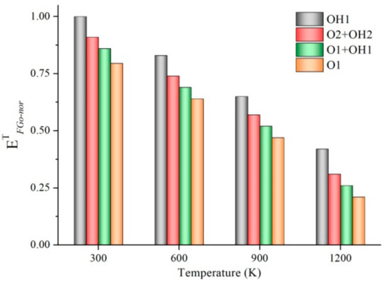 Figure 2 shows the temperature-dependent energy required for breaking bonds connected with FGo. The lower values of were in the O1 model, compared with OH1, O2 + OH2, and O1 + OH1. In addition, the highest values of were in the OH1 model. Clearly, the interfacial bonding ability of the hydroxyl groups is higher than that of the epoxy groups, and the results were consistent with the results of the previous research [34,35]. In addition, values decreased with the increase in temperature. As a result, the interfacial bonding ability between the FGo and the matrix was relatively reduced when the temperature was from 300 K to 1200 K. The result was accordant to the temperature dependence of fracture strength and strain, as previously discussed. Moreover, the FGo is more likely to overcome the interfacial binding energy and get out of the inherent equilibrium position, which leads to instability of the GrO-BN-GBs configuration. The more tiny defects that appear in the atomic lattice, the greater the degradation of facture strength and strain.