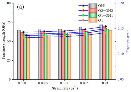 Ceramic-based materials are also subjected to various dynamic loads or sudden change in strain rate. The influence of sudden change of strain rate on the dynamic mechanical properties of GrO-BN-GBs nanostructures needs to be deeply and systematically studied, as shown in Figure 3. Figure 3 shows the fracture strength and strain of the GrO-BN-GBs configuration with FGo density R = 15% at different strain rates (0.0001, 0.0005, 0.001, 0.005 and 0.01 ps−1) and temperatures (from 300 K to 1200 K). The results show the fracture strength and strain increased in the GrO-BN-GBs configuration with the increase in the strain rate. Obviously, the effect of the tensile strain rate on the change of fracture strength and strain was small when the strain rate was in the range of 0.0001 and 0.001 ps−1. However, the effect of the strain rate on the mechanical properties of the GrO-BN-GBs configuration suddenly strengthened when the strain rate was larger than 0.001 ps−1. The value 0.001 ps−1 seems to be a threshold value in the mechanical properties of GrO-BN-GBs configurations.