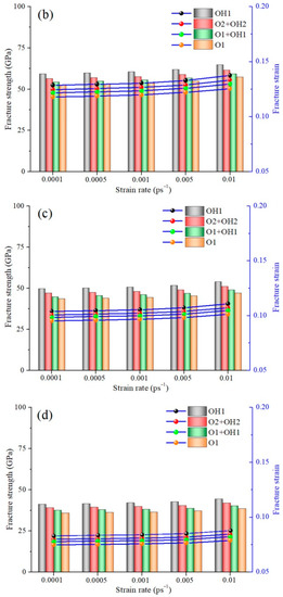 The fracture strength and strain of the GrO-BN-GBs configuration with FGo density R = 15% at different strain rates: (a) temperature = 300 K, (b) temperature = 600 K, (c) temperature = 900 K, and (d) temperature = 1200 K.