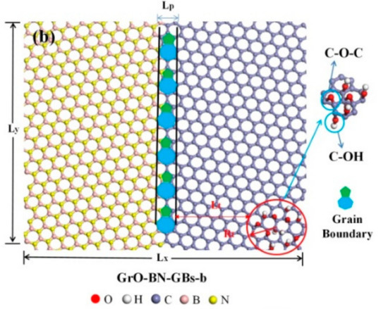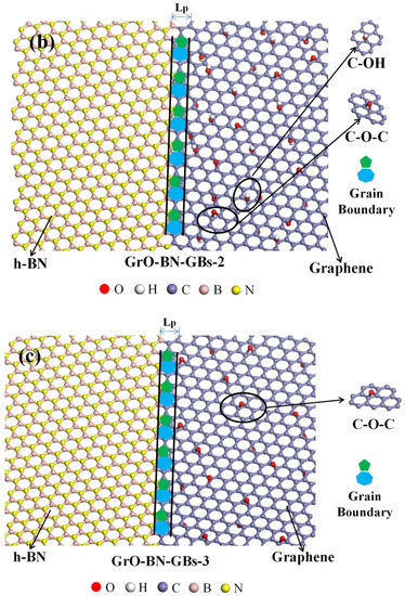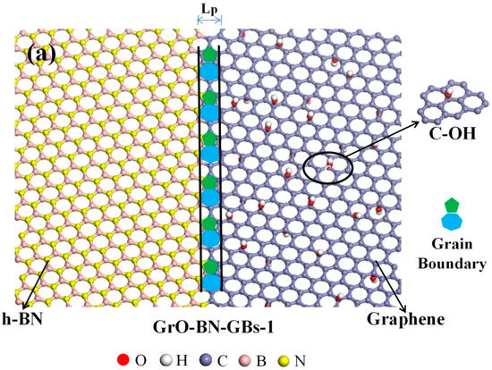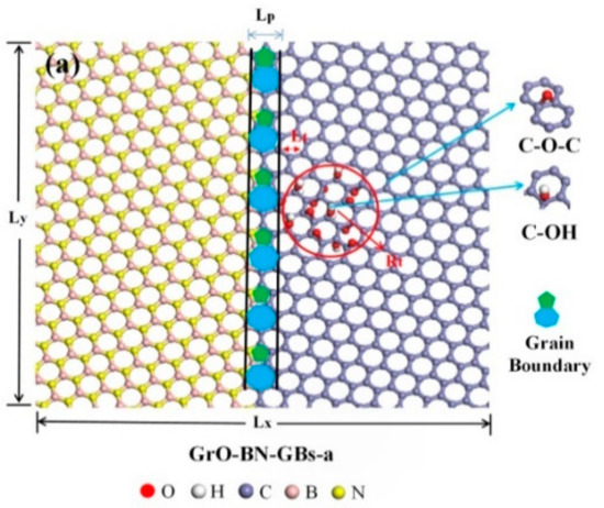 The graphene/h-BN with FGo and GBs (GrO-BN-GBs) was constructed, shown in Figure 8. The three types of FGo, including epoxy (–O), hydroxyl (–OH) and combination of their type were created at the right Gr region of the GrO-BN-GBs configuration. In addition, the classical configuration of GO, that is, the FGs proportion in GO, is approximately 20–30%, according to experimental reports [30]. The density of FGs in the GO-BN-GBs configuration can be defined as R (Equation (21)).