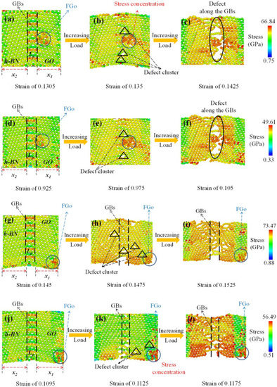 In order to understand more clearly the coupling effects of FGo and GBs on the mechanical properties and interfacial bonding of GrO-BN-GBs configurations at different temperatures, the stress distribution and configuration transition of the simulated model, including before cracking, after reaching the strain limit, and after cracking, is shown in Figure 6. The stress distribution of the GrO-BN-GBs configuration was analyzed by von Mises stresses. Von Mises stresses can be described by the Equation (10):