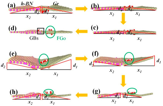 Figure 6 shows the stress distribution and configuration transition of the simulated model, including before cracking, after reaching the strain limit, and after cracking. Considering the different distances between FGo and GBs, at certain times, the lowest amount of von Mises stresses was obtained in the GrO-BN-GBs configurations when the distance between FGo and GBs was less than 3 Å, while the highest value of von Mises stresses was obtained in the GrO-BN-GBs configurations when the distance between FGo and GBs was greater than 20 Å. With the increasing strain, the von Mises stresses were clearly concentrated around the GBs in the GrO-BN-GBs-a model, and ultimately, failure and defect occurred around the GBs. The increased von Mises stresses at the FGo may be the cause of increased stress at the GBs interface. In addition, the distance between FGo and GBs in the Gro-BN-GBs-a model was greater than that in the GrO-BN-GBs-b model. The von Mises stresses contour appeared in the GBs and FGo region. It was confirmed the FGo increased von Mises stresses in the GrO-BN-GBs-b model, generating a stress concentration phenomenon. Therefore, if the distance between FGo and GBs is too close, there will be a von Mises stresses coupling effect.