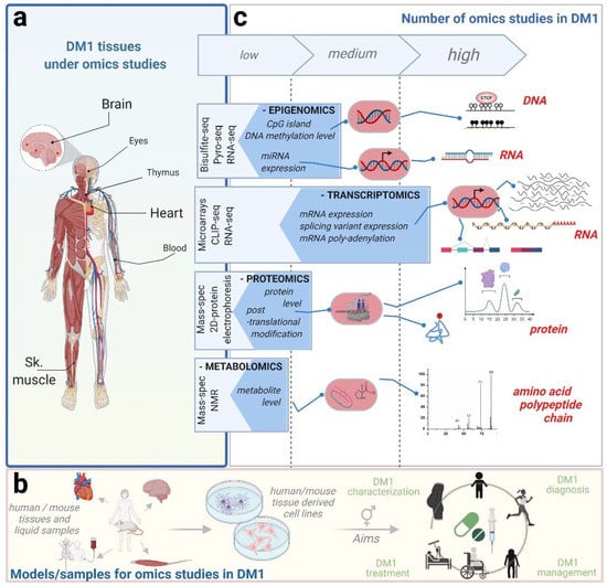 Omics approaches in DM1 research. Research in DM1 relies increasingly on omics-based technologies to decipher molecular pathogeneses in key affected tissues, such as skeletal muscle, brain, and heart (a). Experimental conditions aim to elucidate certain aspects of DM1 pathology and include candidate drug testing on human primary cells, isolated directly from DM1 patient tissues: these retain the morphological and functional characteristics of their tissue of origin but display limited potential for self-renewal and differentiation. Solid omics approaches have therefore also been performed using human immortalized cell lines, as well as samples from different mouse DM1 models (b). Most frequent approaches focus on the transcriptome (RNA-Seq, CLIP-Seq, and microarrays) to build a comprehensive view of DM1 disease status at different levels of RNA metabolism (c). Furthermore, an increasing number of studies using epigenetics, proteomics, and metabolomics approaches are providing novel insights into altered pathways in DM1 (c). Altogether, these technologies provide valuable data for fundamental studies in DM1 but also on translational research characterizing drug mechanisms of action. Created with BioRender.com (accessed date 20 December 2021).