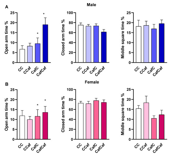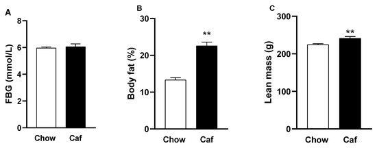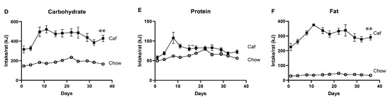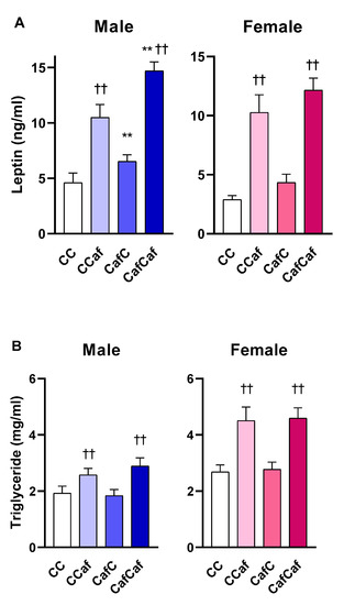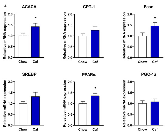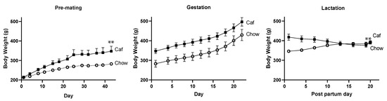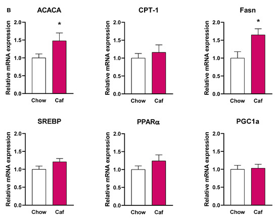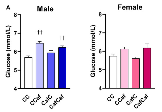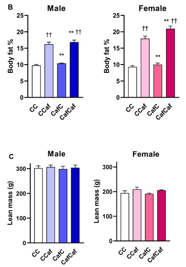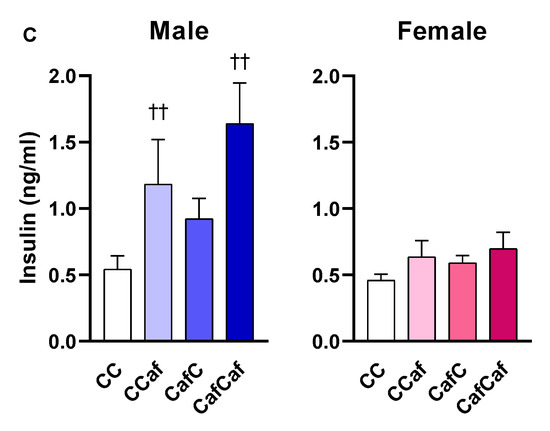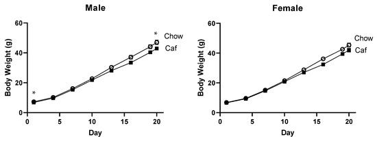 | Maternal Diet | Chow (n = 11) | Caf (n = 10) | Chow (n = 12) | Caf (n = 7) |
