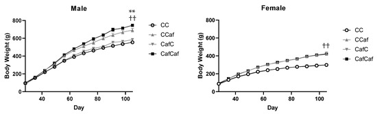 | Body weight (g) | 581.1 ± 12.8 | 724 ± 24.4 †† | 619 ± 11.3 ** | 805.9 ± 14.4 †† ** | 309.4 ± 9.6 | 444.9 ± 27.8 †† | 312.9 ± 10 | 433.7 ± 16.6 †† |