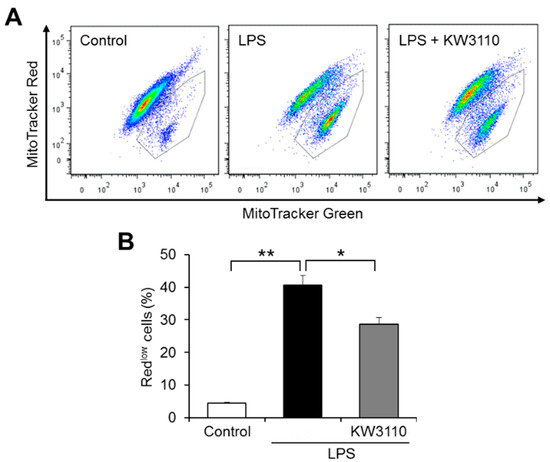 KW3110 treatment suppresses mitochondrial dysfunction in LPS-stimulated J774A.1 cells. J774A.1 cells were treated with KW3110 (1 μg/mL) for 24 h, followed by stimulation with LPS (0.1 μg/mL) for 24 h. Mitochondrial membrane potential was analyzed in cells labeled with MitoTracker Green (mitochondrial stain) and MitoTracker Red (mitochondrial stain dependent on membrane potential) (100 nM). (A) Representative flow cytometry plots of labeled cells. The plots surrounded by a gray line represent cells with lower MitoTracker Red intensity than MitoTracker Green intensity (Redlow cells). (B) The ratio of Redlow cells to total cells was calculated. Values represent means ± SEM. n = 3. Statistical differences were analyzed by ANOVA followed by Tukey’s test. * p < 0.05; ** p < 0.01.