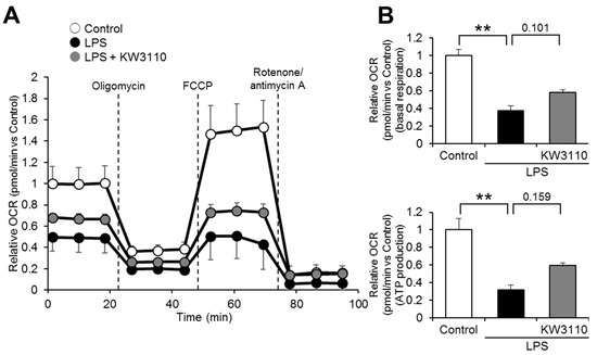 One of the important roles of mitochondria is respiration, which is essential for generating energy for cell activities. Since mitochondrial respiratory function is downregulated in damaged mitochondria [28], we investigated whether KW3110 treatment restores mitochondrial respiratory function in inflammatory-stressed J774A.1 cells. The relative oxygen consumption rate (OCR) was lower in the LPS-stimulated cells than in the control cells at any time point (Figure 3A); the relative OCR in KW3110- and LPS-stimulated cells tended to be partially restored at all time points compared to that in LPS-stimulated cells, even though a significant difference was not detected (Figure 3A). While basal respiration significantly decreased in the LPS-stimulated cells compared to the control cells (p < 0.001; Figure 3B), the basal respiration in KW3110- and LPS-stimulated cells tended to be restored compared to that in LPS-stimulated cells (p = 0.101; Figure 3B). In addition, while adenosine 5′-triphosphate (ATP) production significantly decreased in LPS-stimulated cells compared to that in control cells (p < 0.001; Figure 3B), the ATP production in KW3110- and LPS-stimulated cells tended to be restored compared to that in LPS-stimulated cells (p = 0.159; Figure 3B). These results indicate that KW3110 might have the potential to suppress mitochondrial respiratory dysfunction in inflammatory-stressed macrophages.