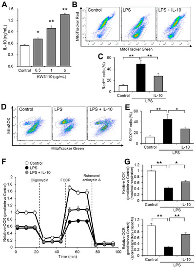 Our previous studies have shown that KW3110 ameliorates the inflammatory responses of macrophages through promoting anti-inflammatory cytokine IL-10 production [17,18]. In this study, we investigated whether IL-10 suppresses inflammatory-stress-induced mitochondrial dysfunction in J774A.1 cells. We confirmed that KW3110 treatment significantly and dose-dependently increased IL-10 production in J774A.1 cells (0.5 μg/mL, p = 0.021; 1 μg/mL, p < 0.001; 5 μg/mL, p < 0.001; Figure 4A). While the ratio of Redlow cells increased significantly in LPS-stimulated cells compared to that of control cells (p < 0.001; Figure 4B,C), the ratio in IL-10- and LPS-stimulated cells decreased significantly compared to that in LPS-stimulated cells (p = 0.004; Figure 4B,C). In addition, while the ratio of cells with a high amount of ROS to total cells (SOXhigh cells) increased significantly in LPS-stimulated cells compared to control cells (p = 0.001; Figure 4D,E), the ratio in IL-10- and LPS-stimulated cells decreased significantly when compared with LPS-stimulated cells (p = 0.026; Figure 4D,E). In considering the mitochondrial respiratory function, relative OCR was lower in the LPS-stimulated cells than in the control cells at any time point, and relative OCR in the IL-10- and LPS-stimulated cells was partially restored at all time points compared to that of the LPS-stimulated cells (Figure 4F). While maximal respiration significantly decreased in LPS-stimulated cells compared to control cells (p < 0.001; Figure 4G), the maximal respiration in IL-10- and LPS-stimulated cells was significantly restored compared to that in LPS-stimulated cells (p = 0.015; Figure 4G). In addition, while spare respiratory capacity significantly decreased in LPS-stimulated cells compared to the control cells (p < 0.001; Figure 4G), the spare respiratory capacity in IL-10- and LPS-stimulated cells was significantly restored compared to that in LPS-stimulated cells (p = 0.003; Figure 4G). These results suggest that IL-10 suppresses inflammatory-stressed mitochondrial dysfunction in macrophages.