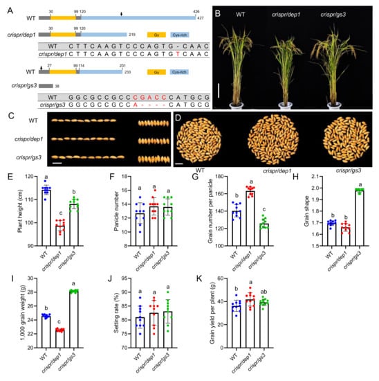- Li, M.; Li, X.; Zhou, Z.; Wu, P.; Fang, M.; Pan, X.; Lin, Q.; Luo, W.; Wu, G.; Li, H. Reassessment of the Four Yield-related Genes Gn1a, DEP1, GS3, and IPA1 in Rice Using a CRISPR/Cas9 System. Front. Plant Sci. 2016, 7, 377. [Google Scholar] [CrossRef] [Green Version]