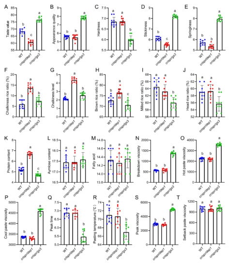 2.3. The Quality Traits of WT and the DEP1 and GS3 Mutants