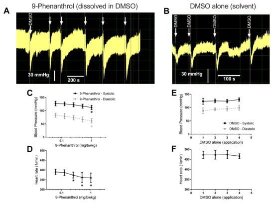 Intravenous administration of TRPM4 inhibitor 9-phenanthrol decreased arterial blood pressure and heart rate. Invasive blood pressure measurement of rats was performed via cannulation of the left carotid artery. TRPM4 inhibitor 9-phenanthrol was administered (shown by unlabeled arrows, in Panel A) through a venous catheter placed in the jugular vein. Consecutive (cumulative) applications were initiated when the blood pressure response stabilized (reached a steady state), usually after 2–3 min. The peak effects observed during the bolus applications are plotted on the graphs. (A) Representative recording; (B) representative recording upon the application of the solvent DMSO alone; (C) systolic and diastolic blood pressure values at the peak of the transient effect of 9-phenanthrol; (D) heart rate at the peak of the transient effect of 9-phenanthrol, where the systolic pressure values were determined. Statistically significant effects upon the cumulative application of 9-phenanthrol (compared to the effect of DMSO (solvent) alone (labeled arrow in panel A), determined by Friedman test) are labeled by the asterisks; (E) effects of repeated DMSO (solvent) application on blood pressure; and (F) heart rate of rats. Graphs show the mean ± SEM. Six animals were tested with 9-phenanthrol (n = 6, panels A,C,D) and a separate six animals were tested with DMSO alone (n = 6, panels B,E,F).