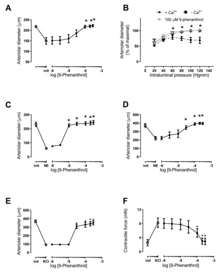 TRPM4 inhibitor 9-phenanthrol completely antagonized myogenic tone and both norepinephrine and KCl evoked vasoconstrictions. Pressure myography of rat skeletal muscle (A–C) and mesenteric (D,E) arteries was performed. Basilar arteries (F) were tested on an isometric force measurement system. (A) Myogenic tone was allowed to develop at 80 mmHg intraluminal pressure (first symbol: before, second symbol: after myogenic tone development), then 9-phenanthrol was added to the organ bath at the indicated concentrations. (B) Myogenic tone was first assessed in the presence of Ca2+ on skeletal muscle arterioles by increasing intraluminal pressure in 20 mmHg increments from 20 mmHg to 120 mmHg. Vessels were then incubated with 100 µM 9-phenanthrol and the same procedure was repeated. Vessels were then thoroughly washed, and diameter was also recorded in the absence of Ca2+. (C) Skeletal muscle arterioles were preconstricted with 10 µM norepinephrine (first symbol: before, second symbol: after norepinephrine, NE); then, 9-phenanthrol was added to the organ bath at the indicated concentrations. (D) Mesenteric arteries were preconstricted with 10 µM norepinephrine (first symbol: before, second symbol: after norepinephrine, NE); then, 9-phenanthrol was added to the organ bath at the indicated concentrations. (E) Mesenteric arteries were preconstricted with 80 mM KCl; then, 9-phenanthrol was added to the organ bath. (F) Basilar arteries were preconstricted with 80 mM KCl; then, 9-phenanthrol was added to the organ bath. Graphs show the mean ± SEM. Significant differences (p < 0.05) from the initial diameter (panels A,C,D) or from the diameter in the presence of Ca2+ (Panel B) are labeled by the asterisks (*). Five (n = 5) animals were used for each panels (A–E), while four animals were used for panel (F).