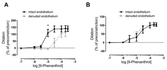 TRPM4 inhibitor 9-phenanthrol completely antagonizes norepinephrine (Panel A) and KCl evoked vasoconstrictions (Panel B), irrespectively of the endothelium. Pressure myography of rat skeletal muscle (A) and mesenteric arteries (B) was performed. Endothelium was removed via intraluminal perfusion of air and distilled water (denuded endothelium). Vessels were preconstricted with 10 µM norepinephrine; then, 9-phenanthrol was added in the indicated concentrations. Significant difference is indicated by the asterisk (*, p < 0.05, Sidak’s multiple comparison) vs. dilation in arteries with intact endothelium. Mean ± SEM are plotted on the graphs. Five (n = 5) rats were used for the experiments.