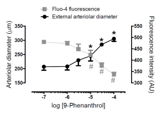 Measurement of the Ca2+ concentration within the vessel wall was also performed. These vessels were incubated for 90 min in Ca2+-containing Krebs–Henseleit solution supplemented with 4.5 µM fluo-4-AM (Thermo Fisher Scientific, Waltham, MA, USA), 100 µM probenecid, 0.5% bovine serum albumin, and 1× PowerLoad (Thermo Fisher Scientific, Waltham, MA, USA). After washing the vessels with Krebs–Henseleit buffer, the arteries were illuminated at 470 nm and the fluorescence signals were detected at 510 nm by video microscopy (InCyt Im2 system, Intracellular Imaging Inc., Cincinnati, OH, USA). The intracellular Ca2+ concentration (fluorescence intensity in the vessel wall) and the external arteriolar diameter were determined using the fluorescent images.