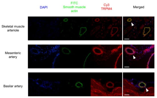 TRPM4 is expressed in the smooth muscle layers of blood vessels used in the functional studies. Tissue sections were prepared from skeletal muscle, mesentery, and brainstem. DAPI: nuclei (blue); FITC smooth-muscle actin: smooth muscle cells (green); Cy3-TRPM4 labeling (red). White arrowheads point to the blood vessels used in the functional studies on merged (overlayed) images. Scale bar = 100 µm. Histological sections were prepared from three animals. It is not known whether the figures for separate arterial beds represent the same or different animals.