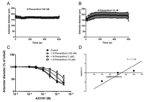 The skeletal muscle arteries were treated with 9-phenanthrol to test the duration of the effects. 9-Phenanthrol evoked a long-lasting concentration-dependent vasodilation (Figure 6A,B). The Ca2+ ionophore A23187 was also tested for vascular responses. The A23187 evoked a concentration-dependent vasoconstriction in the skeletal muscle arteries (Figure 6C). This A23187-evoked vasoconstriction was competitively inhibited by 9-phenanthrol, applied at 0.1–10 µM concentration. The shift in apparent EC50 values for A23187 in the presence of different 9-phenanthrol concentrations (Schild plot, Figure 6D) suggested a Ki value of 1.7 µM (pA2 value was −5.77) for 9-phenanthrol to bind to the A23187 receptor.