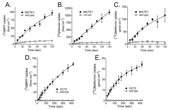 Time courses of uptake of [3H]MPP (~10 nM; (A,D)), [3H]atenolol (~0.25 µM; (B)), or [14C]metformin (~10 µM; (C,E)) into CHO cells that stably expressed either MATE1 (A–C) or OCT2 (D,E). Each point is the average (±SD) of four replicates from a single experiment (each experiment was repeated at least once). Lines describe a hyperbolic rise to a maximum (see text).