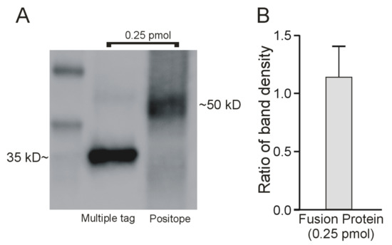 To determine the TOR for MATE1- and OCT2-mediated transport, it was necessary to quantify the number of these proteins expressed on the cell surface. Our workflow included quantifying the amount of cell surface biotinylated transport protein as identified in western blots, using the interaction of a V5-antibody with its epitope (which was engineered into both transport proteins at their C-termini). We then compared the intensity of these bands to a standard curve determined in parallel, using a commercial protein that contained the V5-epitope. This approach assumed that the efficiency of interaction of the antibody with its epitope, accessed in a western blot, is independent of its flanking protein sequence(s). Although this is a common assumption, we tested it by comparing the intensity of V5 antibody interaction with two different commercial epitope-tagged fusion proteins, Multiple Tag (Genscript) and Positope (ThermoFisher Scientific), both of which included the V5 epitope sequence (in addition to several other common epitope tags). Western blots revealed a single anti-V5 immunoreactive band for both the Multiple Tag and Positope fusion proteins (35 kD and 53 kD, respectively; Figure 3A). The signals generated by each fusion protein were quantified by densitometry using ImageJ 1.34 s software and showed that the mean ratio of the Multiple Tag to the Positope signal from three experiments was close to 1 (Figure 3B), suggesting that the different flanking fusion proteins minimally affected the efficiency of interaction with the monoclonal anti-V5 antibody. Multiple Tag, however, consistently displayed a more distinct band that did Positope. Therefore, we subsequently used the Multiple Tag fusion protein as the standard for quantitative western blotting. The interaction of the V5 antibody with increasing amounts of Multiple Tag protein, determined through dose-dependent densitometry, was linear over a 32-fold range of sample protein content (Figure 4).
