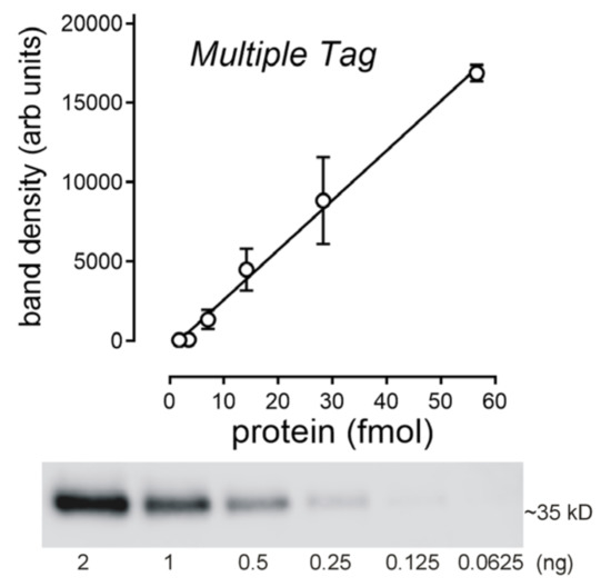 Standard curve relating western blot band density, associated with binding of a V5 monoclonal antibody, to increasing amounts of Multiple Tag protein. Each point is the mean (±SD) of band density determinations determined from blots from four separate experiments. Lower panel shows a representative blot.