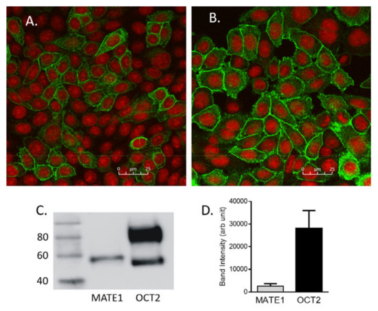 Immunocytochemical localization of (A) MATE1 and (B) OCT2 in CHO cells that stably expressed these transporters. The transfected constructs both included a C-terminal V5 epitope that was visualized using a fluorescently-tagged (green) secondary antibody. Nuclei were visualized using propidium iodide (red). Both images were linearly stretched, with the stretch to the MATE1 image being equal to that applied to the OCT2 image. (C) Western blot comparing the level of total cell (crude membranes) expression of MATE1 and OCT2 in these cells. (D) Densitometric assessment of the MATE1 band versus that larger (fully glycosylated) OCT2 band. Bar height reflects the mean (±SD) of band densities measured in three different passages.