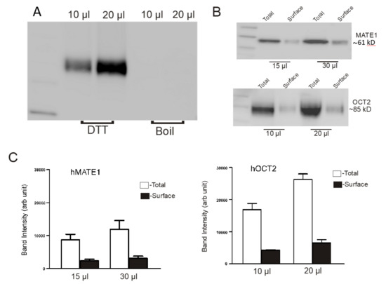 Subsequent experiments used DTT to ensure the complete separation of biotinylated proteins from the beads. Representative western blots of isolated total protein and surface protein of MATE1 and OCT2 after cell surface biotinylation are shown in Figure 6B. Figure 6C shows a summary of total protein and surface protein for MATE1 (left panel) and OCT2 (right panel) from three independent experiments. MATE1 expressed at the cell surface was 24.9 ± 1.9% of total MATE1 protein; similarly, cell surface OCT2 protein represented 24.4 ± 2.7% of the total OCT2 protein expressed by the cell.
