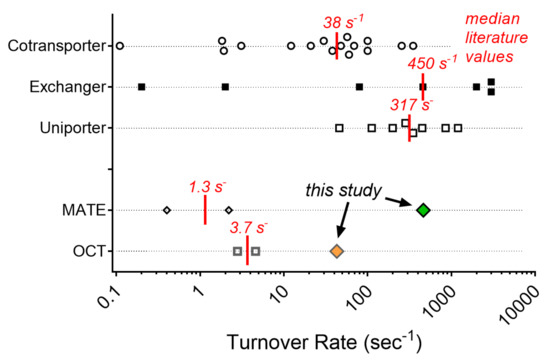 The TOR values we obtained for OCT2 and MATE1 are larger than those reported by Yin et al. [21]. Although the previous discussion accounted for the basis of some this discrepancy, it worth comparing them to values reported for other transport processes. Though not an exhaustive list, Supplementary Table S1 presents TOR values for a number of processes that represent several different mechanistic classes of transporter, i.e., facilitated diffusion (uniporters), and secondary active co- and counter-transporters (exchangers). Figure 8 displays these values, to facilitate their comparison. OCT2 is a uniporter and a member of the major facilitator superfamily (MFS). It is, perhaps, fortuitous that TOR values have been determined for two families of MFS uniporters, the GLUTs and the ENTs; of the eight TOR values reported, the range of values is from 46 to 1200 s−1, with a median value of 317 s−1. This range of values is substantially larger than the value of 3.7 s−1 obtained by Yin et al. [21], but reasonably similar to the values we obtained, which averaged ~40 s−1. MATE1 is an exchanger (counter transporter), and TOR values have been reported for two families of counter-transporters, the Na/H exchangers (NHEs) and the (synaptic) vesicle monoamine transporters (VMATs/SVATs). The MATEs display a structural organization [62] quite distinct from either the VMATs (which are members of the MFS), and the NHEs [63]. The TOR reported for MATE1-mediated atenolol transport was 0.4 s−1, whereas the TOR we determined for atenolol was 460 s−1. The range of literature TOR values for counter-transporters was 0.2 to 3000 s−1, with a median value of 450 s−1 (Supplementry Table S1; Figure 8). It is difficult to draw any conclusions from these comparisons; the range of values is just too large. However, we suggest that a TOR of 0.4 s−1, in light of the conditions employed in the measurements of transport, certainly represents a significant underestimate of the likely turnover rate of the process under physiological conditions.