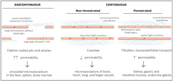 Vascular endothelial cells line the entire circulatory system and show remarkable heterogeneity. Even though endothelial cells originate from the same progenitor cells during development, they eventually contribute to different subtypes of endothelia. Based on morphology, the microvasculature consists of three main phenotypes: discontinuous, fenestrated, and non-fenestrated endothelium (Figure 1). These morphological differences correlate with vascular permeability and contribute to organ-specific functions. Non-fenestrated endothelium has a low permeability, which is found in brain, heart, and lung microvessels, as well as within all larger vessels (i.e., arteries and veins). A fenestrated endothelium has transcellular pores of about 70 nm in diameter [], which are covered by a thin, non-membranous diaphragm. As fenestrae are associated with increased filtration and trans-endothelial transport functions, they are found in kidney, endocrine glands, and gastric and intestinal mucosa. Lastly, discontinuous endothelium is found exclusively in sinusoidal endothelium, such as the bone marrow, the spleen, and the liver endothelium. The latter has larger fenestrations, up to 100 or 200 nm in diameter, that are devoid of a diaphragm and have large pores within individual cells []. Additionally, the underlying basement membrane is only partly developed, resulting in a high permeability. Each organ is made up of different types of endothelia. In the kidney, fenestrated endothelium in the peritubular capillaries and glomeruli ensures proper filtration, while continuous endothelium elsewhere provides the kidney itself with nutrients and oxygen []. Similarly, circumventricular organs of the brain are lined with fenestrated endothelium, while elsewhere, the tight blood–brain barrier (BBB) is found [].