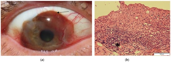 (a) Clinical picture of CM shows the pigmented tumor overgrowing the limbus and prominent feeder vessels (arrow); (b) Histological picture (Hematoxylin Eosin) of CM: The architecture of the epithelium is destroyed and the basal membrane (broken line) is disrupted by the tumor. Asterisk (*) marks an accumulation of atypical melanocytes characterized by pyknic and basophil cell bodies.