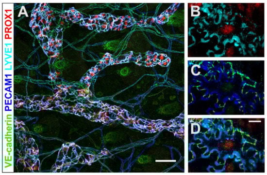 Lymphatic vessels play a central role in the maintenance of tissue fluid balance, dietary lipid absorption and the trafficking of immune cells []. In healthy tissue, blind ending initial or capillary vessels of the mature lymph vessel system take up interstitial fluids, solutes and extravasated immune cells and transport this complex mixture “the lymph” via collecting vessels to the draining lymph nodes [,]. For efficient uptake, capillary lymphatic endothelial cells (capLECs) are endowed with specialized button junctions where focal accumulations of endothelial adhesion and tight junction molecules alternate with long intermittent membrane stretches rich in PECAM-1 and the hyaluronan receptor LYVE-1 [,], leading to a characteristic oak leaf shape (Figure 2).