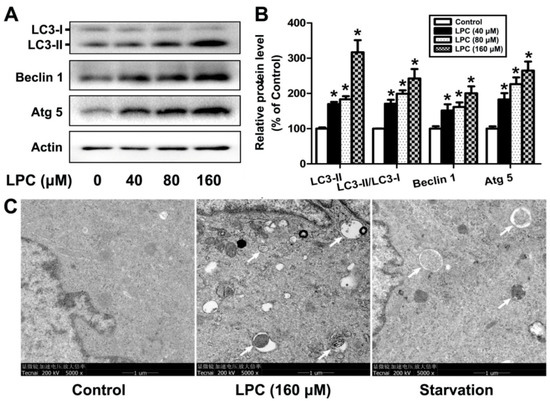 LPC induces autophagy of mouse ovarian granulosa cells. (A) The cells were treated with 0–160 μM LPC for 24 h; then the protein levels of Beclin1, Atg5 and LC3 were detected by Western blot. (B) The relative protein levels of Beclin1, Atg5 and LC3. (C) The cells were treated with 0 or 160 μM LPC for 24 h; then the number of autophagic vacuoles was detected by transmission electron microscopy. Starvation, a positive control group, was induced by treatment with Earle’s balanced salt solution (EBSS) for 2 h. The autophagic vacuoles are pointed out by arrows. * p < 0.05.