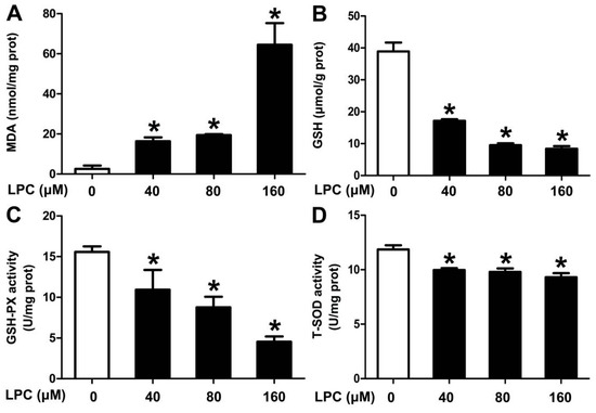 LPC induces oxidative stress of mouse ovarian granulosa cells. The cells were treated with 0–160 μM LPC for 24 h; then the contents of MDA (A) and GSH (B) and the enzyme activities of GSH-PX (C) and SOD (D) were detected. * p < 0.05.