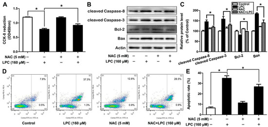 Oxidative stress is involved in LPC-induced apoptosis of mouse ovarian granulosa cells. The cells were treated with 160 μM LPC for 24 h in the presence or absence of 5 mM NAC, then the cell viability (A), the protein levels of cleaved caspase-8, cleaved caspase-3, Bax and Bcl-2 (B,C), and the number of annexin V-FITC-positive cells (D,E) were observed by CCK-8, Western blot and flow cytometry, respectively. * p < 0.05.