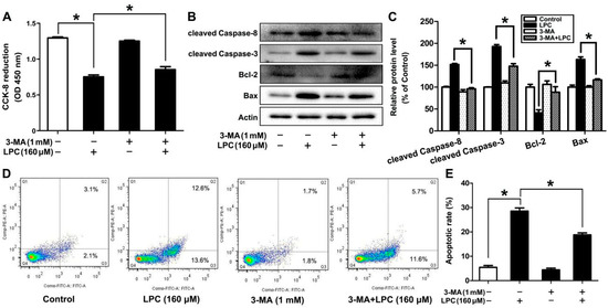 In view of the aforementioned information, the interaction between apoptosis and autophagy is discussed.In this study, GCs were treated with 160 μM LPC for 24 h, in the presence or absence of 3-MA (1 mM), which can block autophagy. Compared to the LPC-treated group, the inhibition of cell viability and induction of apoptosis by LPC could be alleviated by 3-MA (Figure 6). In brief, autophagy promoted LPC-induced apoptosis in mouse ovarian granulosa cells.