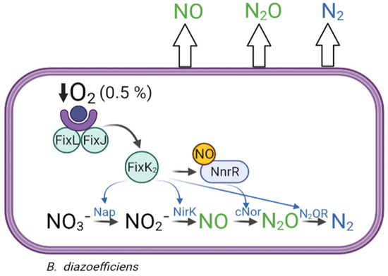 B. diazoefficiens is considered a model bacterium to study denitrification in rhizobia, since it is the only rhizobial species that, in addition to fixing N2, has the ability to grow under anoxic conditions by reducing NO3− through the complete denitrification pathway, a process widely studied in this bacterium both in free-living conditions and in symbiosis with soybeans [12,13,16]. B. diazoefficiens possesses the complete set of napEDABC, nirK, norCBQD, and nosRZDFYLX denitrification genes [12], which encode the periplasmic nitrate reductase (Nap), copper-containing nitrite reductase (NirK), nitric oxide reductase type c (cNor), and nitrous oxide reductase (N2OR), respectively (Figure 1). Like many other denitrifiers, expression of denitrification genes in B. diazoefficiens requires both oxygen limitation and the presence of NO3− or a nitrogen oxide (NOx) derived from its reduction. The response to low oxygen (≤0.5% O2 in the gas phase, i.e., ≤5–10 µM O2) is mediated by the FixLJ-FixK2-NnrR regulatory cascade [3], in which the response regulator FixJ in its active phosphorylated form induces the expression of several genes, including fixK2, which encodes the transcriptional regulator FixK2 (Figure 1). This protein induces the expression of more than 300 genes, including genes associated with microoxic metabolism (fixNOQP), denitrification genes (napEDABC, nirK, norCBQD, and nosRZDFYLX), and regulatory genes (rpoN1, fixK1, and nnrR) [12,17,18]. It has also been demonstrated that expression of napEDABC, nirK, and nosRZDFYLX genes requires microoxic conditions and directly depends on FixK2, while expression of norCBQD genes relies on NO, being the transcriptional regulator NnrR the candidate that directly interacts with norCBQD promoter [19,20] (Figure 1).
