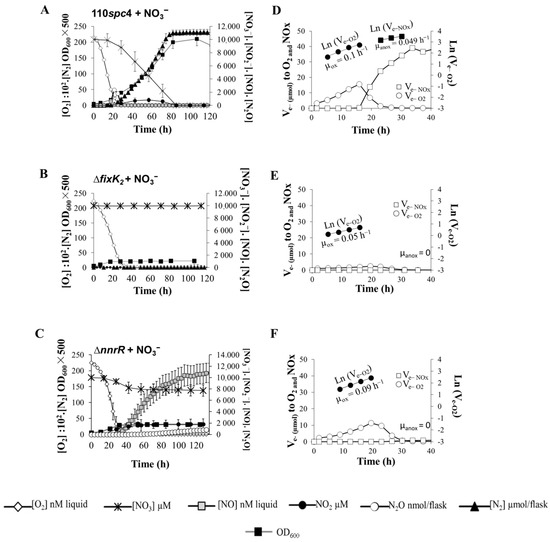 Denitrification phenotypes of the parental strain B. diazoefficiens 110spc4 (A) and the two mutant strains ∆fixK2 (B) and ∆nnrR (C). (A–C) measurement of O2 and NO3− respiration, concentrations of denitrifying intermediaries (NO2−, NO, N2O, N2), and bacterial growth (OD600) yielded from such dynamics. (D–F) electron flow rates to O2 and nitrogen oxides (NOx). Cells were incubated with 2% O2 and 10 mM NO3− as oxic and anoxic respiratory substrates, respectively. O2, NOx concentrations, and bacterial growth were monitored by automatic sampling from headspace and liquid phase. See Figure S1 to visualize individual gases’ dynamics from (A,C). Data are the means and standard deviations of at least three different cultures.
