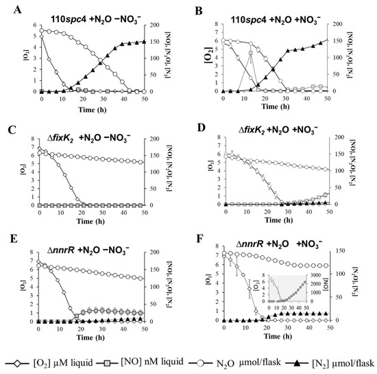 Strikingly, B. diazoefficiens strains lacking the regulatory transcriptional factors FixK2 or NnrR were severely impaired in N2O consumption capacity and growth (Figure 3C–F, Table 2A,B). Despite ∆fixK2 being unable to reduce N2O and grow either in the absence or the presence of NO3−, traces of NO gas were detected after 40 h incubation with NO3− (Figure 3D), but such residual respiratory activity was not coupled to growth. A mutant strain defective in the nnrR gene was significantly defective in its capacity to reduce N2O when incubated without NO3− (only 8 (±0.5)% of N2O was reduced to N2), likely due to its incapacity to detoxify NO, which permanently accumulated in the medium up to 32.2 (±8.8) nM (Figure 3E, Table 2B). The presence of NO3− slightly induced N2O reduction by the nnrR mutant (12.5 (±2.1)% of N2O was reduced to N2) at O2 concentrations of 0.8 (±0.3) μM after 13 h incubation (Figure 3F, Table 2B). However, under these conditions, NO3− in the medium was further reduced to NO, which was accumulated after 20 h incubation reaching levels up to ~2 µM after 50 h incubation (Figure 3F, insert, Table 2B).