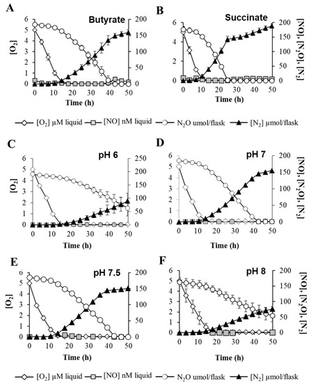 Impact of C-source and pH on N2O consumption. Measurement of O2 and N2O respiration and concentrations of NO and N2. B. diazoefficiens 110spc4 parental strain was incubated in vials containing 0.5% O2, 5% N2O, and 10 mM NO3− as substrates for aerobic and anaerobic respiration, respectively. C-sources (A,B) and pH (C–F) of the growth medium were modified as shown on the graphs (see Material and Methods for further details). O2 and NOx concentrations were monitored by automatic sampling from headspace phase. Data are the means and standard deviations of at least three different cultures.