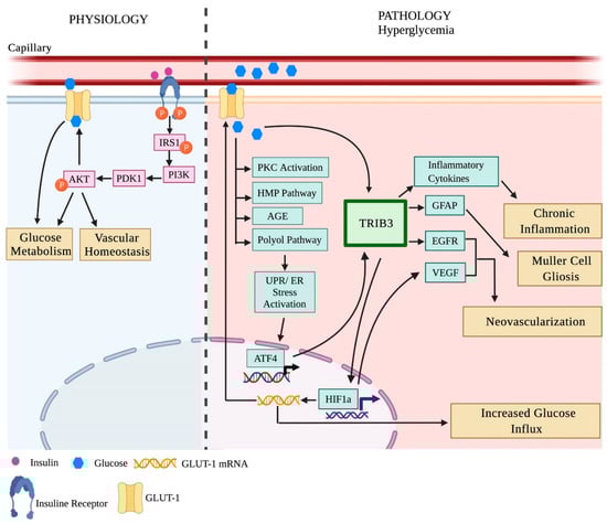 Tribbles homolog 3 (TRIB3) protein controls the development and progression of diabetic retinopathy. The PERK UPR marker TRIB3 is a known psuedokinase that binds and prevents AKT phosphorylation by PDK1. In addition, it controls the expression of HIF1α, EGFR, GFAP, and inflammatory cytokines in cells. In hyperglycemic retinas and retinas of mice with proliferative retinopathy, TRIB3 is significantly upregulated. This results in overexpression of HIF1α, EGFR, GFAP, and inflammatory cytokines (Icam1, Nf-kb1, Rc3h1, Zc3h12a, VEGF, COX2, and AIF1, []). In turn, overexpressed HIF1α leads to GLUT1 activation and, together with TRIB3, increases the influx of glucose, which affects the overall glucose metabolism in diabetic retinas. Aberrant glucose flux and hyperglycemia in diabetic retinas are responsible for the activation of PKC, HMP, AGE, and polyol pathways, which eventually leads to chronic UPR activation. TRIB3-mediated pro-inflammatory cytokine expression results in chronic inflammation, GFAP increase leads to the retinal gliosis observed in proliferative retinas, and VEGF elevation triggers neovascularization in the late stages of DR. Image created by Biorender.com, (accessed on 30 May 2021).