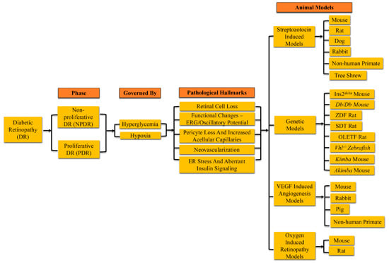 One of the key regulators of homeostatic balance within the glucose metabolism in the body is insulin, which is produced by the beta cells of the pancreas. The insulin receptor–signaling pathway facilitates the entry of glucose into the cells through the activation of the protein kinase B (AKT)-mediated glucose transporter (GLUT1). In humans, fasting blood glucose level (BGL) is maintained in the range of 92–126 mg/dL, while the postprandial blood glucose level is in the range of 97–140 mg/dL. It is well accepted that under fasting and postprandial conditions, BGL levels above 126 mg/dL and 180 mg/dL, respectively, are considered sustained hyperglycemia []. It is now accepted that hyperglycemia primarily drives NPDR, while sustained hypoxia results in the progression of PDR. Thus, based on these facts, animal models that mimic the pathophysiological events of DR were developed. These models differ by the approaches used to induce hyperglycemia (pharmaceutical agents, pancreatectomy, or genetically modified animals [,,,,]), their classification in the phylogenic tree (rat, mouse, rabbit, monkey, zebrafish, dog, pig, cat, and tree shrew), the observed neuronal and vascular changes, and the activation of cellular signaling (Table 1).