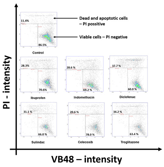 Cytometric assay of apoptosis in MCF7 cells. After 24 h of incubation with selected drugs (0.75 mM ibuprofen; 0.5 mM indomethacin; 0.375 mM diclofenac; 0.06 mM sulindac; 0.02 mM celecoxib; and 0.02 mM of troglitazone), the cells were stained with fluorescent dyes using Solution 5 (ChemoMetec®) containing Propidium Iodide and VB48. Cells in the upper polygon are apoptotic or dead. Cells in the lower right polygon are healthy living cells.